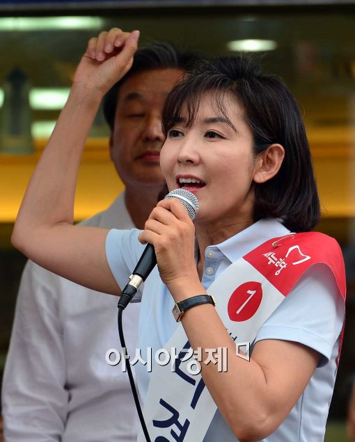 [아시아경제 최우창 기자]7·30 재보궐 선거를 이틀 앞둔 28일 서울 동작을에 출마한 나경원 새누리당 후보가 중앙대학교병원 인근에서 유권자들에게 지지를 호소하고 있다.