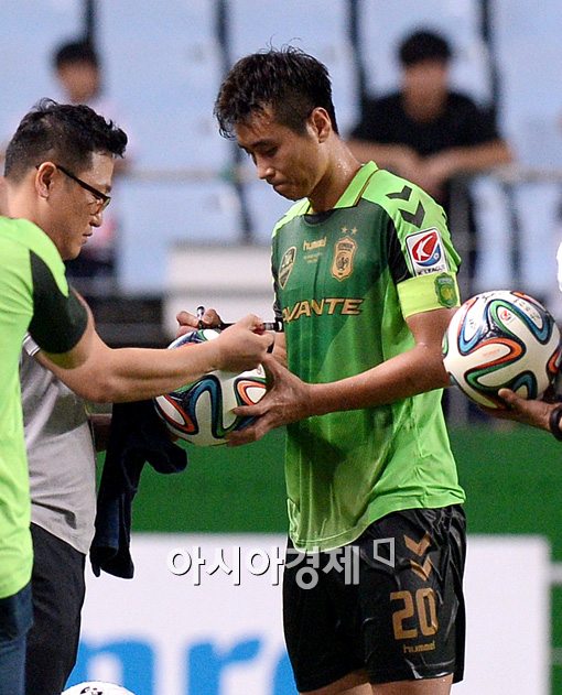 [전주=아시아경제 김현민 기자] 전북 현대가 6일 전주월드컵경기장에서 열린 프로축구 'K리그 클래식 2014' 수원 삼성과의 경기에서 3-2로 역전승을 거두고 선두 자리를 굳건히 지켰다. 경기 후 멀티골을 터뜨리며 눈부신 활약을 펼친 전북 이동국이 최다골 신기록을 기록한 매치볼에 사인을 하고 있다.