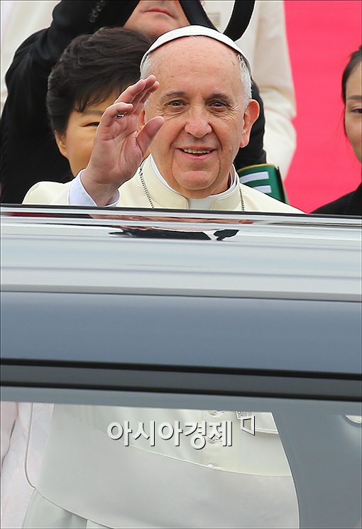[아시아경제 윤동주 기자] 프란치스코 교황이 14일 오전 경기도 성남 서울공항을 통해 입국, 차량에 탑승하기전 손을 흔들고 있다.