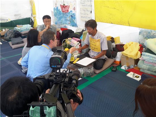 16일 서울 광화문 세월호 유가족 단식 농성장에서 세계 최대의 민간 텔레비전 방송국인 TV글로부 취재진이 32일째 단식농성중인 고(故) 김유민양 아빠 영오씨(오른쪽)를 인터뷰하고 있다.