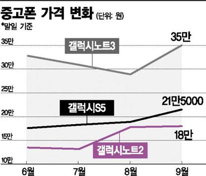 중고 휴대폰 유통업자들이 적용하는 시세표를 보면 삼성전자의 갤럭시S4는 지난 6월 17만6000원에서 7ㆍ8월 18만9000원에 거래되다가 지난달 30일에는 21만5000원까지 올랐다. 갤럭시노트2도 6월에는 13만5000원이었지만 지난달 말에는 18만원까지 상승했다.