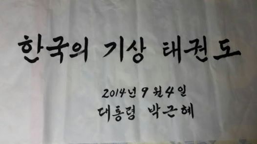 박 대통령은 또 글과 함께 '한국의 기상 태권도, 2014년 9월 4일 대통령 박근혜"라고 쓴 자신의 붓글씨도 공개했다. 이는 지난 4일 열린 무주 태권도원 개원식 기념표석에 남겼던 내용이다.