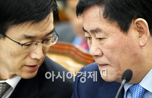[아시아경제 윤동주 기자] 최경환 경제부총리 겸 기획재정부 장관(오른쪽)이 27일 서울 여의도 국회에서 열린 기획재정위원회의 기재부 등에 대한 국정감사에서 방문규 2차관과 의견을 나누고 있다.
