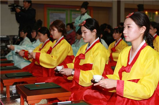 식전행사로 가야금 병창에 이어 한국전례연구원 예절시연단과 송천동예절 교실이 도와 전통관례와 계례, 현대 성년례의 순으로 전문적이고 체계적인 의식으로 거행됐다.