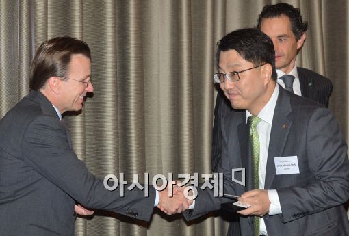 [아시아경제 최우창 기자] 진웅섭 금융감독원 원장이 11일 서울 여의도 콘래드 호텔에서 열린 외국계 금융회사 CEO 조찬 간담회에 참석, 참석자들과 인사를 나누.