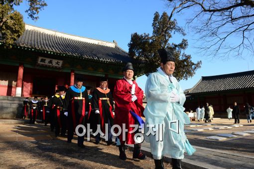 [아시아경제 백소아 기자] 정규삼 성균관대 총장(빨간옷)이 8일 서울 종로구 성균관대 대성전에서 취임식을 마치고 고유례(告由禮)를 올리고 있다. 고유례는 학교의 경사스러운 일이 있을 때마다 선현들에게 알리는 의식이다.