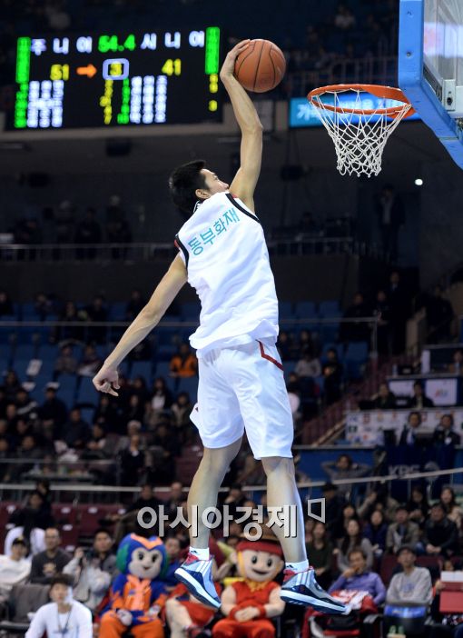 [아시아경제 김현민 기자] 2014-2015 프로농구 올스타전 2일차 시니어매직팀과 주니어드림팀의 경기가 11일 잠실실내체육관에서 열렸다. 정효근이 덩크 콘테스트 결승에서 실력을 뽐내고 있다.