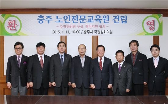 조길형 충주시장, 이심 대한노인회장, 윤범로 충주시의회 의장, 이종배 새누리당 의원, 관계자들은 11일 오후 4시 충주시청에서 노인전문교육원 건립추진위원회 구성과 노인전문교육원을 지을 터 등 세부사항을 논의했다.