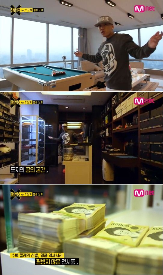 특히 도끼는 "우리 집에 전시돼 있는 돈다발이 있다"며 옷 방 한 가운데 실제 5만 원 권을 전시해둔 진열대를 공개했다. '억'소리 나는 돈뭉치를 전시해 놓은 것에 대해 도끼는 "사실 돈을 잘 쓰지 않는다. 그러다 한 번씩 뭉치로 쓰게 된다"면서 "돈은 종이 쪼가리일 뿐이다. 나는 거기에 휘둘리지 않는다"는 소신을 전했다.