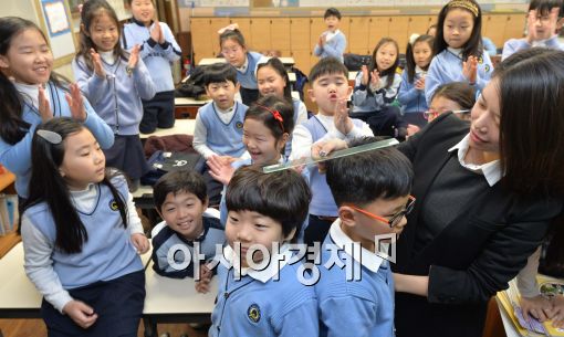[아시아경제 최우창 기자] 서울시내 초등학교가 개학을 시작한 21일 서울 동대문구 장안동 은석초등학교에서 선생님이 학생들의 키를 자로 재고 있다.