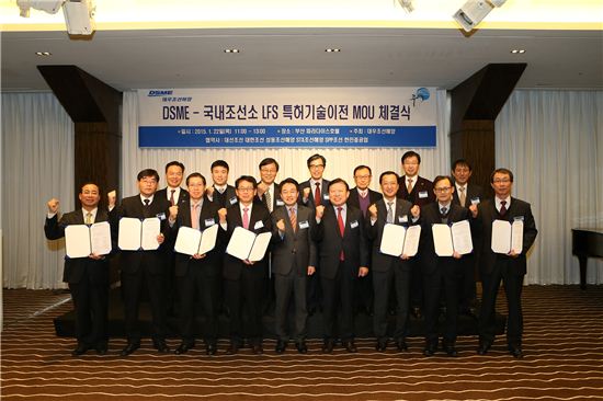 대우조선은 지난 22일 부산 해운대 파라다이스호텔에서 국내 조선소들과 특허기술 이전 MOU 협약을 맺고 LNG연료 추진 선박(LFS)의 설계·엔지니어링 기술이전을 추진키로 했다고 23일 밝혔다.