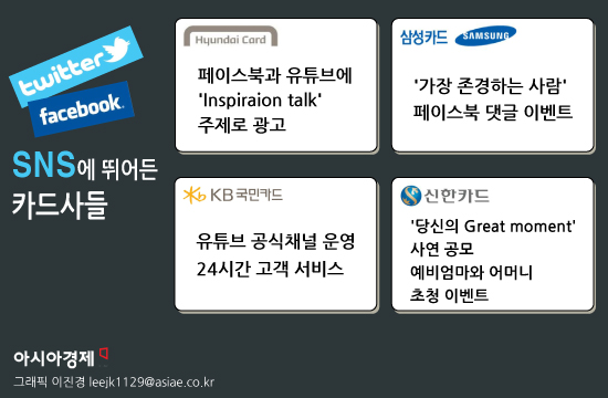 [아시아경제 이현주 기자] 카드업계가 소셜네트워크서비스(SNS)를 활용한 마케팅 경쟁을 치열하게 전개하고 있다. 페이스북, 트위터, 유튜브 등 각 종 SNS를 통해 고객과의 공감대 형성은 물론 이를 통한 브랜드 차별화를 추구하기 위해서다.