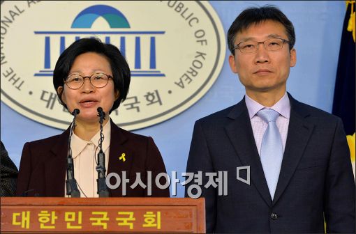[아시아경제 윤동주 기자] 헌법재판소 결정으로 의원직을 읽은 옛 통합진보당 소속 이상규, 김미희 전 의원이 4월 재보궐선거 출마 기자회견을 하고 있다.