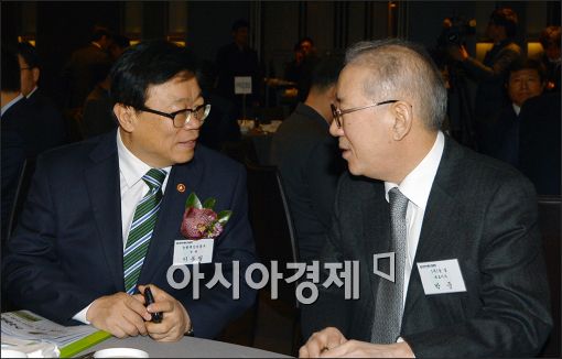 [아시아경제 윤동주 기자] 이동필 농림축산식품부 장관(왼쪽)이 6일 서울 중구 플라자호텔에서 열린 식품업계 CEO 조찬간담회에서 박준 농심 대표와 이야기를 나누고 있다.