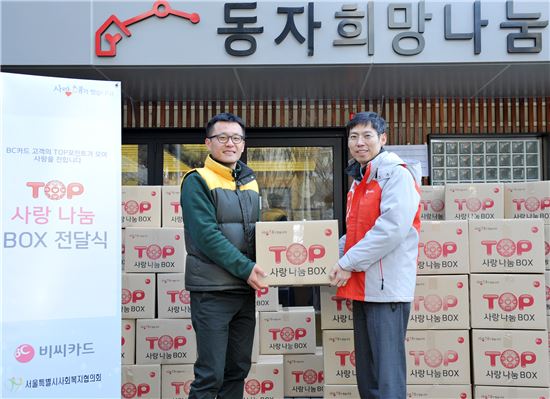 [아시아경제 이현주 기자] BC카드는 동자동 쪽방촌에 거주하는 65세 이상 어르신들에게 쌀과 반찬 등 먹거리를 담은 'TOP 사랑 나눔 박스' 전달 행사를 가졌다고 13일 밝혔다.