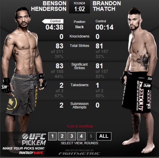 타격전이 이어지는 가운데 헨더슨은 구석으로 몰리며 위기에 처했다. 재빠른 움직임으로 펜스에서 벗어났지만 분위기를 가져간 태치는 긴 다리를 이용해 헨더슨에게 테이크 다운을 뺏는 등 매섭게 몰아붙였다.