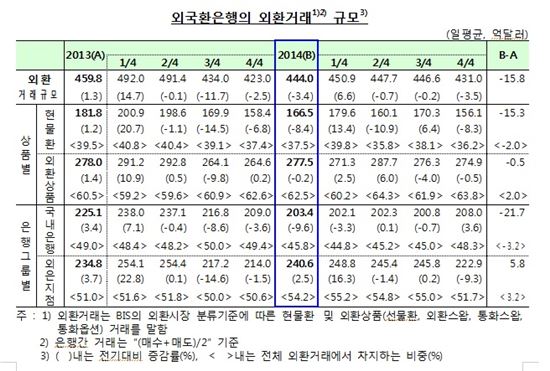 23일 한국은행이 발표한 '2014년중 외국환은행의 외환거래 동향'에 따르면 작년 외국환은행의 외환거래규모는 일 평균 444억달러로 전년 459억8000만달러 보다 3.4% 줄었다.