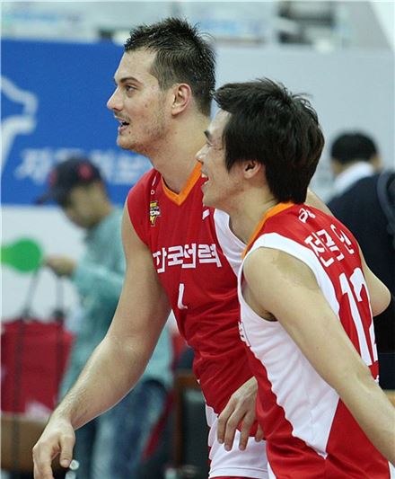 한국전력은 26일 수원체육관에서 열린 NH농협 2014-2015 V리그 남자부 6라운드 홈경기에서 대한항공에 세트스코어 3-1(25-14 25-20 22-25 25-22)로 이겼다. 시즌 21승째(11패·승점 59)로 순위는 3위. 남은 네 경기에서 승점을 추가하지 못하더라도 4위 대한항공(승점 46)이 남은 경기에서 얻을 수 있는 최대승점이 58점이라 순위를 뒤집을 수 없다. 다섯 경기를 남긴 5위 현대캐피탈(승점 46)이 전승으로 승점 15점을 추가하면 순위가 바뀌지만 한국전력은 승점 2점이 뒤진 4위를 확정해 준플레이오프를 할 수 있다. 남자부는 정규리그 3,4위 팀의 승점 차가 3점 이내면 다음달 19일 단판으로 준플레이오프를 한다. 한국전력이 포스트시즌 무대에 나서는 것은 2011-2012시즌 이후 세 시즌 만이자 2005년 프로출범 이후 두 번째다. 외국인 공격수 미타르 쥬리치가 블로킹 일곱 개, 서브 득점 세 개, 후위공격 열두 개로 트리플크라운(블로킹·서브·후위공격 각 3개 이상)을 달성했다. 국내무대 네 번째 기록과 함께 42점을 올려 승리를 책임졌다.