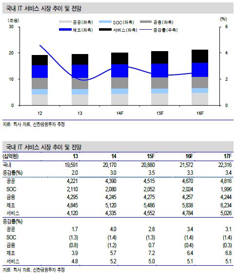 IT서비스 사업은 2015~2017년 연평균 8% 외형 성장을 이룰 것으로 내다봤다. 2015년 국내 IT서비스 시장은 전년보다 3.5% 증가한 20조9000억원으로 추정했다.