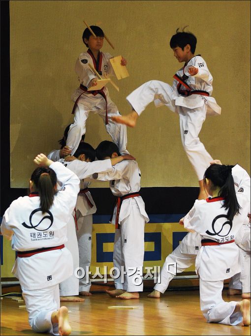 [아시아경제 윤동주 기자] 11일 서울 서대문구 미동초등학교 태권도 시범단 학생들이 태권도 시범을 선보이고 있다.