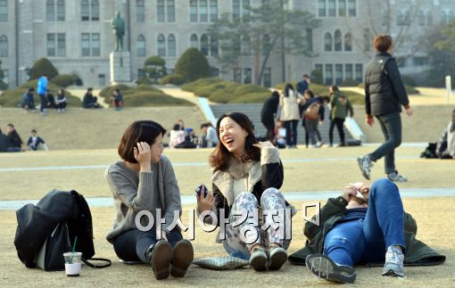 [아시아경제 최우창 기자] 완연한 봄 날씨를 보인 16일 서울 성북구 고려대학교에서 학생들이 가벼운 옷차림으로 캠퍼스에 이야기 꽃을 피우고 있다.