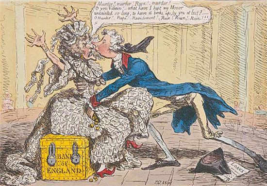 제임스 길레이의 그림 '위기에 빠진 영란은행은'은 18세기(1797년) 나온 풍자만화다. 200여년이나 지났다. 늙고 힘없는 여자(중앙은행)가 젊은 백작(정부)에게 강탈당하는 듯한 오래된 공식으로 중앙은행을 바라보는 시대는 이미 지나지 않았을까.
