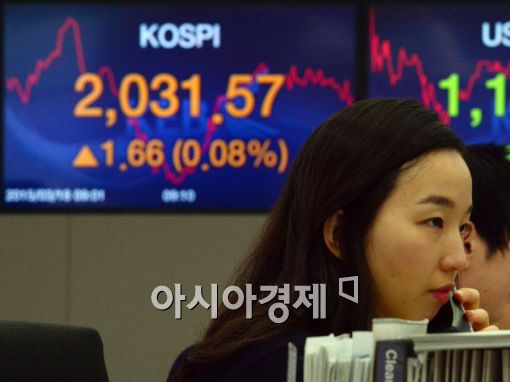 [아시아경제 백소아 기자] 18일 서울 중구 외환은행 본점 딜링룸에서 딜러들이 외환업무를 보고 있다. 이날 코스피 지수는 전날보다 2.28p 오른 2032.19로 출발해 약보합세를 이어가고 있다.