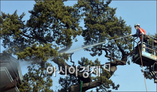 [아시아경제 윤동주 기자] 20일 서울 중구 정동 배재학당 앞에 심어진 수령 520년이 넘은 향나무를 중구청 관계자들이 세척하고 있다.