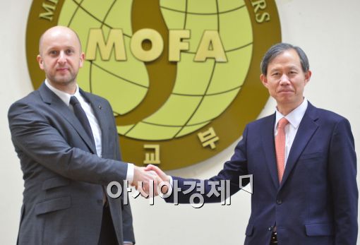 [아시아경제 백소아 기자] 23일 서울 세종로 정부서울청사에서 열린 제3차 한-폴란드 경제공동위에서 안총기 경제외교조정관(오른쪽)과 안줴이 디하(Andrzej Dycha) 폴란드 경제부 차관이 악수를 하고 있다. 이번 경제공동위를 통해 양국은 공공인프라, 에너지, 보건, 방산에 이르는 폭넓은 이슈에 대해서 논의할 예정이다.