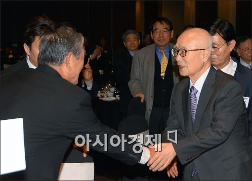 [아시아경제 윤동주 기자] 김우중 전 대우그룹 회장이 23일 서울 종로구 AW컨벤션센터에서 열린 대우그룹 창립 총회에 참석해 대우그룹 전 임원들과 인사를 나누.