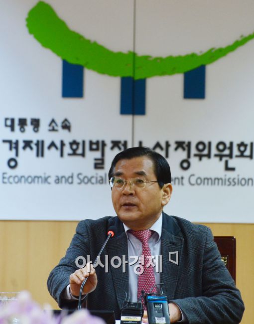 [아시아경제 백소아 기자] 김대환 노사정위원장이 24일 서울 세종로 정부서울청사 노사정위원회에서 노동시장 구조개선 지원활동에 대한 브리핑을 하고 있다. 이날 김 위원장은 "3월말까지 노동시장 구조개선을 위한 대타협에 이르지 못하면 위원장직에서 책임을 지고 물러나겠다"고 밝혔다.