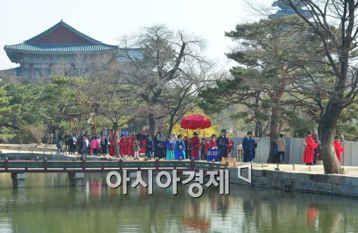 [아시아경제 백소아 기자] 문화가 있는 날인 25일 서울 종로구 경복궁에서 왕가의 산책이 재현되고 있다.