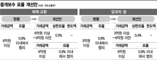 임대차의 경우도 마찬가지다. 종전 3억원 이상 임대차에서 0.8% 이내에서 협의했던 것을 3억원 이상 6억원 미만 구간을 신설해 최대 요율을 절반(0.4%)으로 낮췄다.