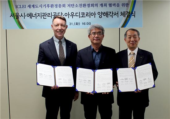 (왼쪽부터) 요그 디잇츨 아우디코리아 마케팅이사, 장혁재 서울시 기후환경본부장, 유효경 에너지관리공단 기후대응이사가 기후환경총회 후원 3자간 업무협약을 체결했다.