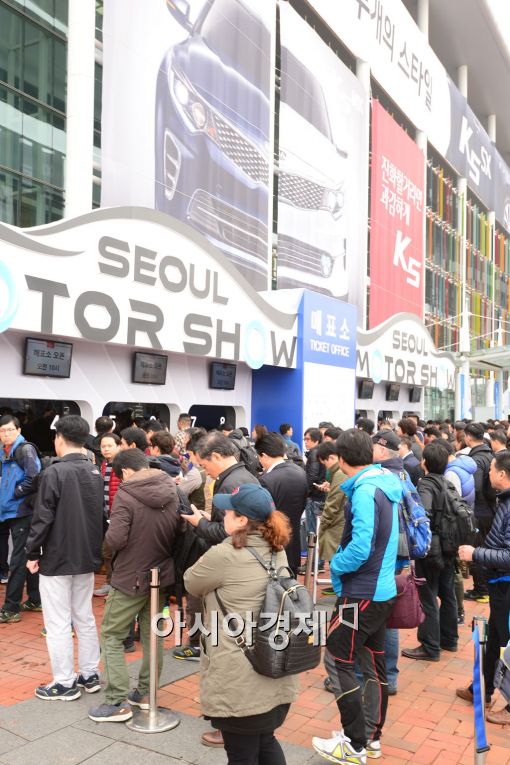 [아시아경제 백소아 기자] 2015 서울모터쇼가 시작되는 3일 경기도 고양시 킨텍스 제1전시장 매표소 앞에 많은 관람객들이 줄을 서고 있다. 역대 최대 규모인 32개 완성차 브랜드가 참가해 350여대의 차량이 전시되는 2015 서울모터쇼는 12일까지 열흘간 진행된다.