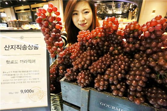 [아시아경제 최서연 기자] 갤러리아명품관 식품관인 고메이494에서 8일부터 올해 대전시 산내동에서 출하되는 첫 국내산 햇포도(데라웨어)를 선보였다. 햇포도인 데라웨어 포도는 일반포도보다 당도가 높으며, 씨가 없고 크기가 작아 먹기가 용이하다. 갤러리아백화점은 명품관을 비롯한 전 지점(수원점, 센터시티, 타임월드, 진주점)식품관에서 100g당 9900원에 판매한다.
