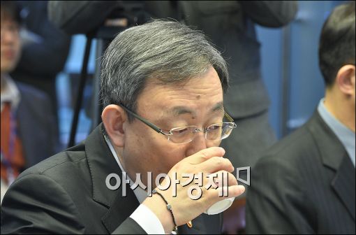 [아시아경제 윤동주 기자] 단통법과 KBS수신료 인상 등 각종 현안을 논의하기 위해 9일 서울 여의도 국회에서 열린 미방위 당정협의에 참석한 최성준 방통위원장.