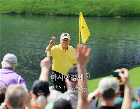 잭 니클라우스가 파3 콘테스트 경기 도중 4번홀 그린에서 홀인원한 공을 꺼낸 뒤 손을 들어 갤러리의 박수갈채에 답례하고 있다. 오거스타(美 조지아주)=사진=Getty images/멀티비츠