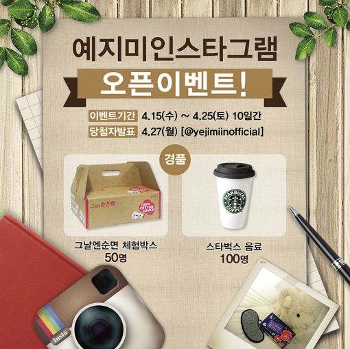 특히 이번 인스타그램 오픈을 기념해 오는 25일까지 공식 인스타그램 채널(@yejimiinofficial)을 팔로우하고 친구들을 소환하면 추첨을 통해 100명에게 '스타벅스' 음료쿠폰을 증정한다. 또 '예지'라는 이름을 가진 인스타그래머가 '예지'임을 증명할 수 있는 사진을 업로드 하고 #예지는_미인이다, #yejimiinstagram, #yejimiin 해시태그를 달면 '그날엔순면' 체험박스(50명)를 증정한다.