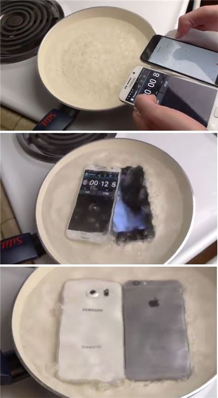 IT전문매체 폰아레나는 16일 갤럭시S6와 아이폰6를 물이 펄펄 끓는 프라이팬에 동시에 넣고 변화를 관측하는 실험을 유튜브에 공개했다. 외관상으로는 액정화면이 더 오래 버틴 갤럭시S6의 압승이었다.