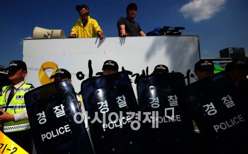 [아시아경제 백소아 기자] 30일 서울 세종로 정부서울청사 앞에서 416가족협의회 주최로 열린 정부의 세월호 특별법 대통령령(시행령) 수정안에 대한 의견서 전달 및 강행통과 저지를 위한 기자회견에서 경찰이 음향차량 주위를 에워싸고 있다.