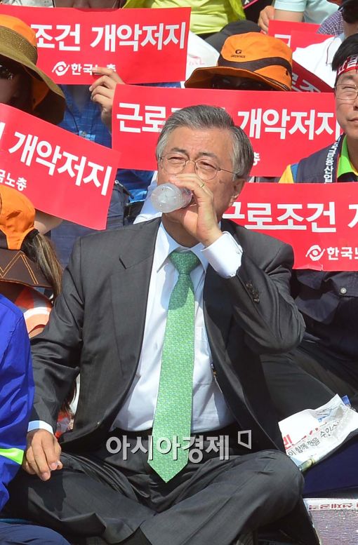[아시아경제 백소아 기자] 1일 서울 영등포구 여의도공원에서 열린 노동시장 구조개악 저지 전국노동자대회에서 문재인 새정치민주연합 대표가 물을 마시고 있다.