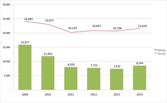 최근 5년 사이 연도별 산지전용 면적은 2010년 1억1851만㎡→2011년 8026만㎡→2012년 7753만㎡→ 2013년 7432만㎡로 줄어드는 흐름을 보이다 5년 만에 는 것이다.