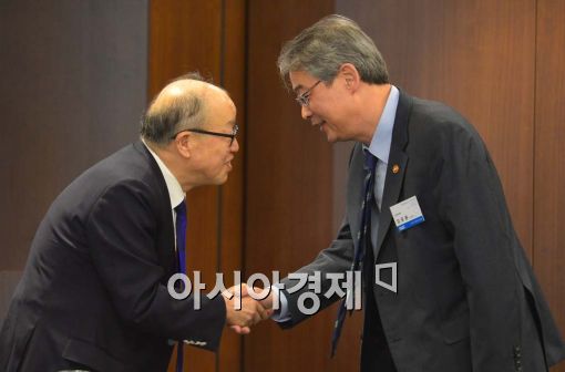 [아시아경제 백소아 기자] 7일 서울 중구 은행회관에서 열린 21세기 금융비전포럼에서 임종룡 금융위원장(오른쪽)과 홍인기 카이스트 교수가 악수를 하고 있다.