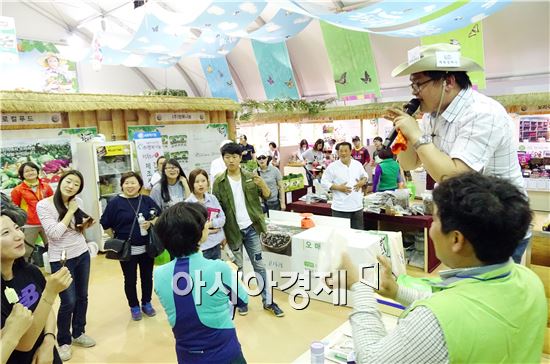 초여름 날씨가 이어진 가운데 9일 함평나비축제가 열리고 있는 함평엑스포공원에 전국에서 수많은 관광객들이 몰려 나비와 꽃을 보면서 봄을 만끽했다. 이날 로컬푸드직매장에서 함평농특산물 100원경매를 진행해 관광객들에게 인기를 끌고있다.