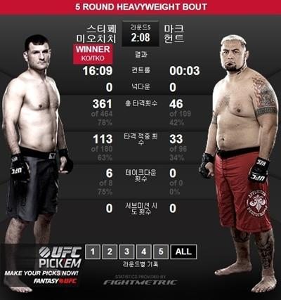 헌트는 4라운드 막판 간신히 그라운드에서 빠져나와 일어났지만 이미 힘이 빠질 대로 빠진 뒤였다. 미오치치는 5라운드에서 파운딩과 서브미션으로 경기를 끝내려 했다.