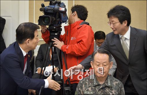 [아시아경제 윤동주 기자] 북한의 동해안 함대암 미사일 발사등 잇따른 도발 위발 위협과 관련해 군의 안보태세를 점검하기 위한 긴급 당정협의가 11일 서울 여의도 국회에서 열렸다. 회의에 참석한 한민구 국방장관(왼쪽)이 유승민 새누리당 원내대표와 악수를 나누고 있다.