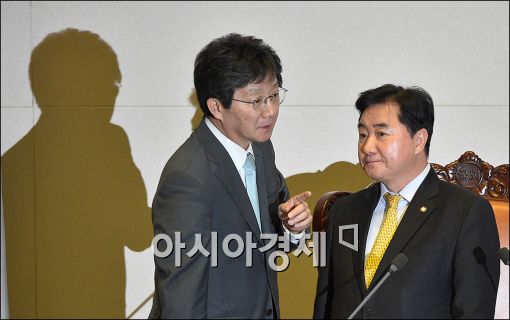 [아시아경제 윤동주 기자] 12일 국회 본회의장에서 유승민 새누리당 원내대표가 국회의장석으로 올라가 이석현 국회 부의장과 이야기를 나누고 있다.