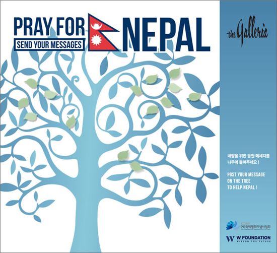 갤러리아는 15일부터 6월14일까지 산업통산자원부 산하에 설립된 비영리 국제구호기관인 '소통을위한 젊은재단(W-재단)'과 함께 '네팔을 위해 기도해주세요(PRAY FOR NEPAL) 캠페인'을 전개한다.