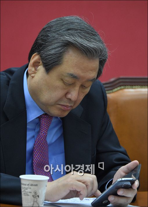 [아시아경제 윤동주 기자] 김무성 새누리당 대표가 14일 서울 여의도 국회에서 열린 최고위원회의에서 회의 도중 휴대폰을 확인하고 있다.